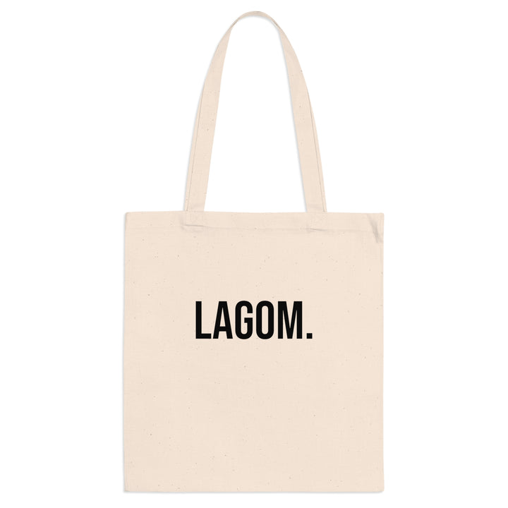 “LAGOM.” på en naturfärgad tote i solid kvalitet. Rymmer vardagen utan att skrika. Trycks on-demand i EU—noll lager, noll waste. Bara edge.