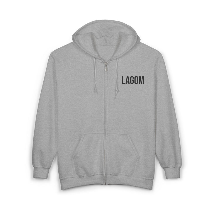 “LAGOM.” på en tung zip-hoodie för höst/vinter. Minimal text, maximal användning. Trycks on-demand i EU – inget lager, inget slöseri. Bara edge.